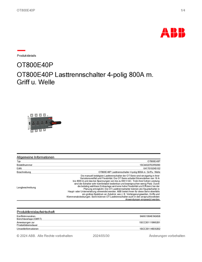 1SCA022753R5090 ABB 1SCA022753R5090 Rozłącznik OT800E40P, 1000 V, 800 A