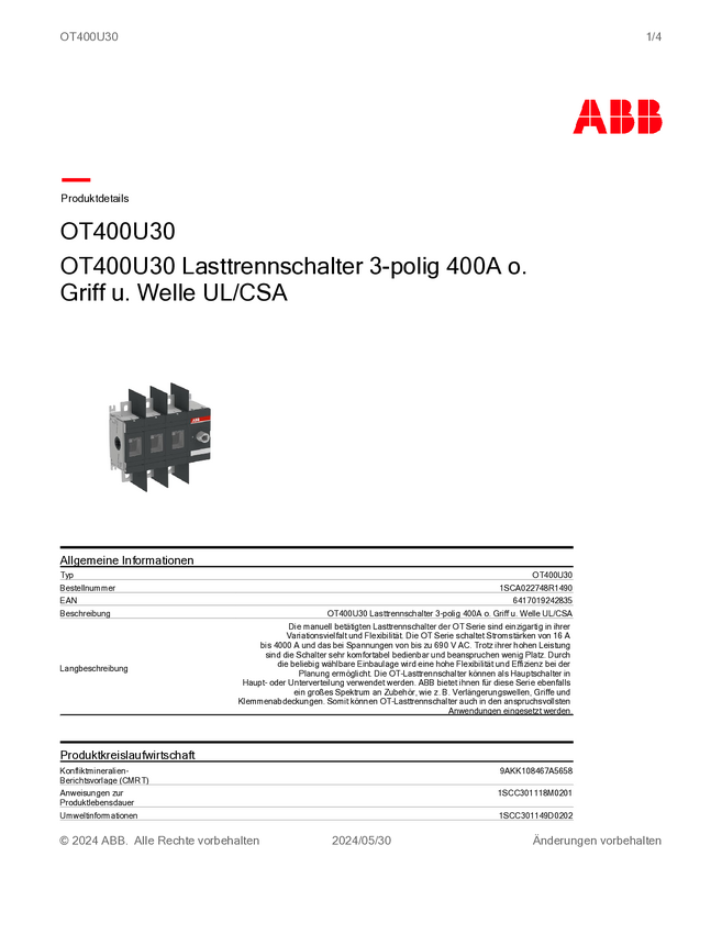 1SCA022748R1490 ABB 1SCA022748R1490 Rozłącznik OT400U30, 1000 V, 400 A