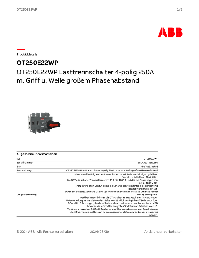 1SCA022745R0180 ABB 1SCA022745R0180 Rozłącznik OT250E22WP, 1000 V, 250 A