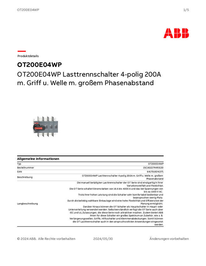 ABB OT200E04WP Rozłącznik 200 A 1000 V czarny 1 szt.