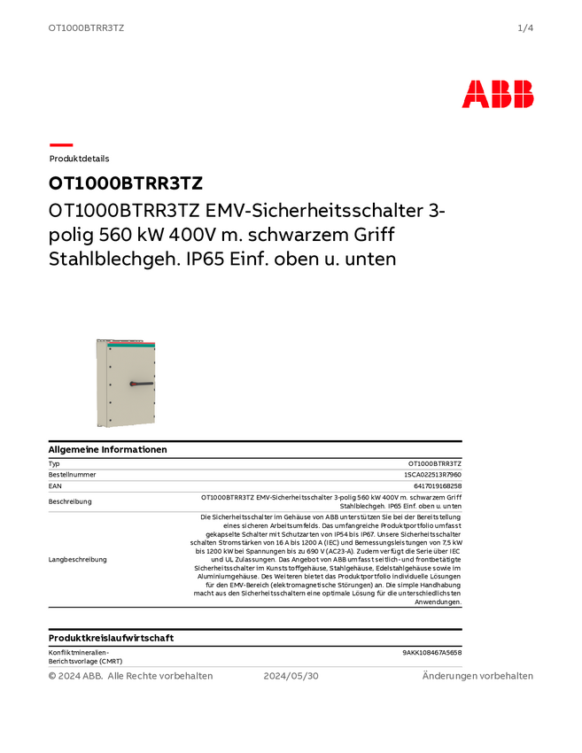1SCA022513R7960 ABB 1SCA022513R7960 Wyłącznik bezpiecznikowy OT1000BTRR3TZ, 1000 V, 1000 A
