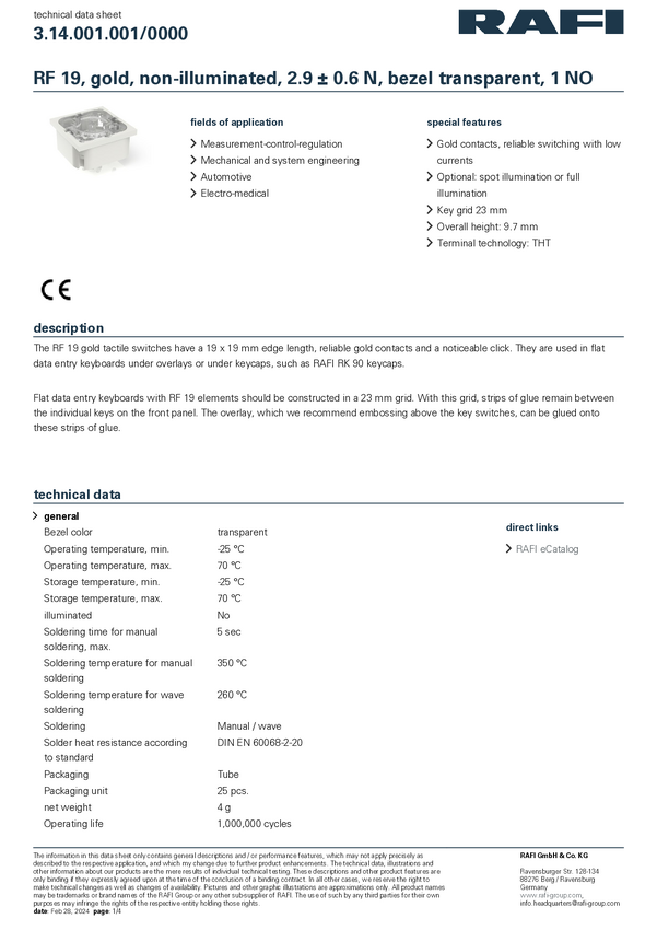 3.14.001.001/0000 RAFI 3.14.001.001/0000 DT152 Przycisk 35 V 0.1 A chwilowy (D x S x W) 1...