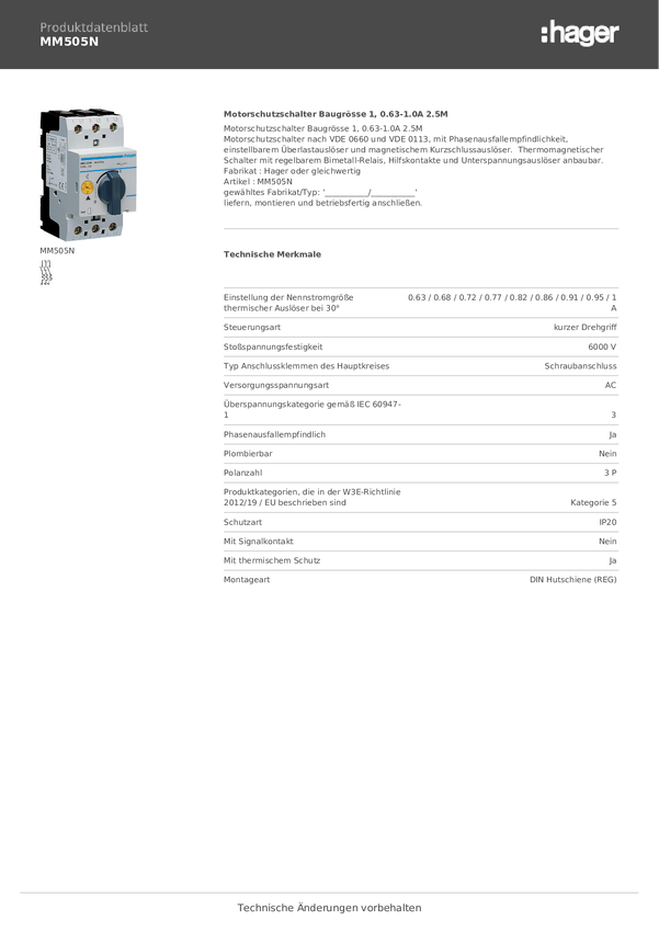 MM505N Hager MM505N Przełącznik ochronny silnika 230 V, 400 V 1 szt.
