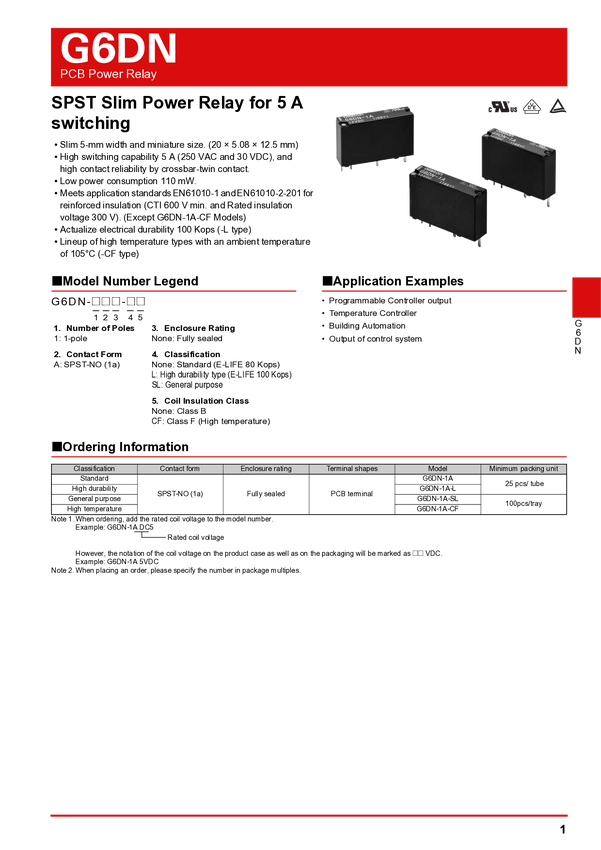 Omron G6DN-1A-CF-DC4.5 Przekaźnik mocy, monostabilny, 1 cewka, 125 V/DC, 5 A, 1 szt.