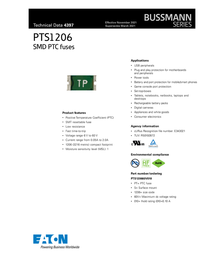 PTS120630V016 Eaton PTS120630V016 Bezpiecznik SMD 5000 szt. taśma na dużej rolce