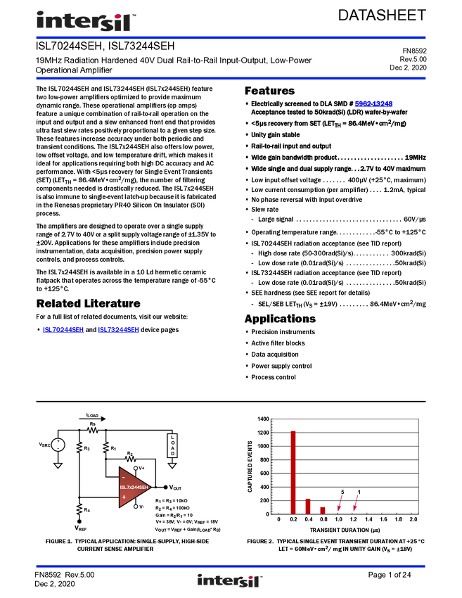 ISL70244SEHX/SAMPLE 19MHz Radiation Hardened 40V Dual Rail-to-Rail Input-Output, Low-power Oper...