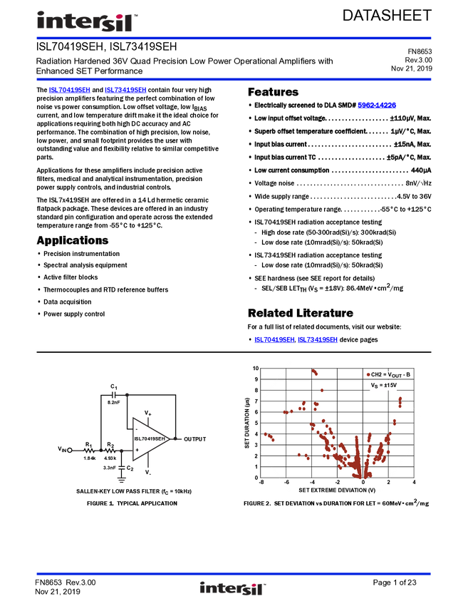 ISL70419SEHX/SAMPLE Radiation Hardened 36V Quad Precision Low Power Operational Amplifier With...
