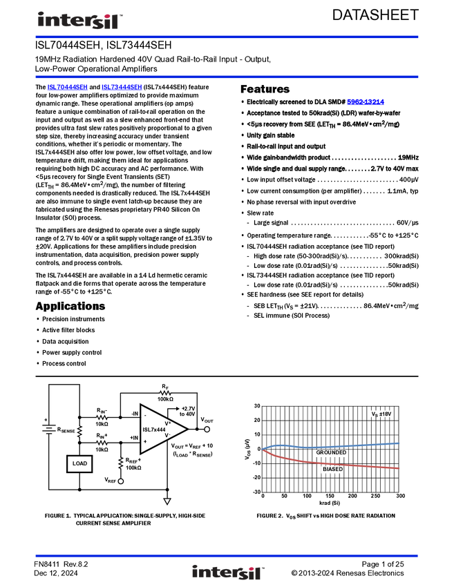 ISL70444SEHX/SAMPLE 19MHz Radiation Hardened 40V Quad Rail-to-rail Input-output, Low-power Oper...