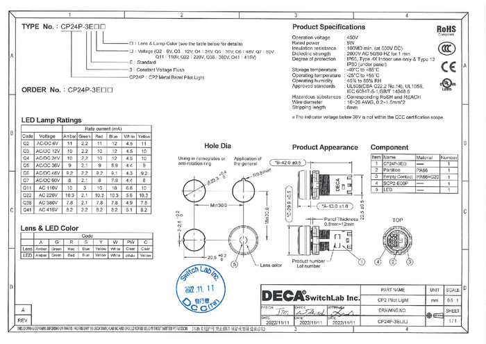 DECA CP24P-3EQ4G Lampka sygnalizacyjna CP24P-3EQ4G, 22.3 mm, 24 V DC/AC, 8 A, 1 szt.