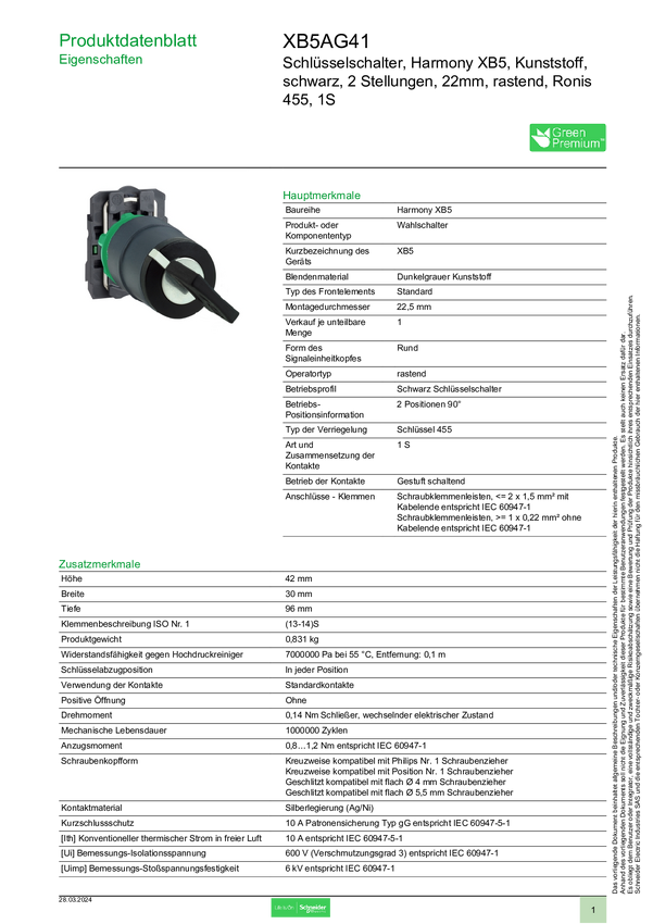 XB5AG41 Schneider Electric XB5AG41 Przełącznik kluczykowy IP67 1 szt.