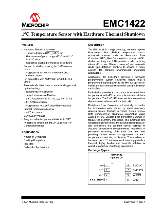 EMC1422 - 1C Temperature Sensor with Hardware Thermal Shutdown