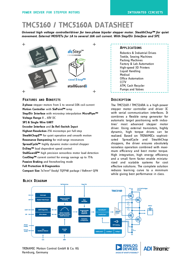 Stepper motor cDriver 8 to 60V, for external N-Fets with S/D and SPI Interface, 256 µSteps, SixPoint ramp controller, CoolStep, StallGuard2, SpreadCycle and StealthChop2