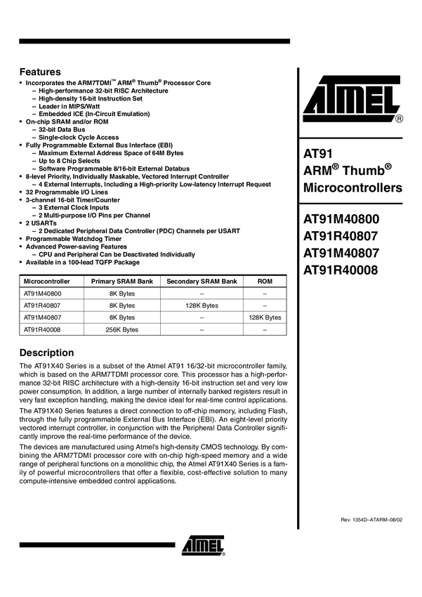 AT91M40800 AT91X40 Series: AT91M40800, AT91R40807, AT91M40807, AT91R40008 - Complete D...