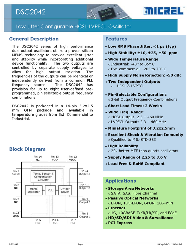 DSC2042 - Low-Jitter Configurable HCSL-LVPECL Oscillator