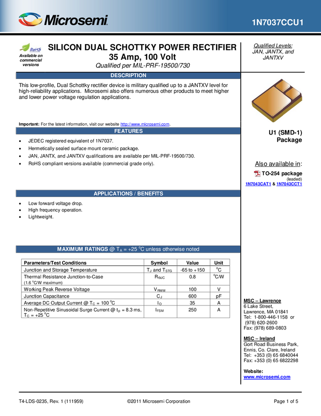 JAN1N7037CCU1-Rectifier, JANTXV1N7037CCU1-Rectifier, JANTX1N7037CCU1-Rectifier