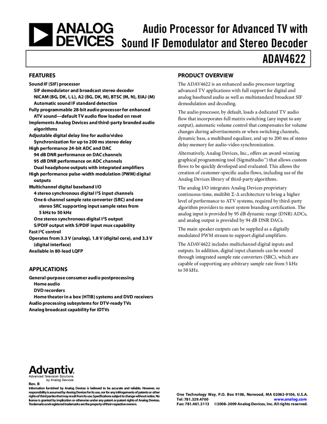 ADAV4622 Audio Processor for Advanced TV with Sound IF Demodulator and Stereo Decode...