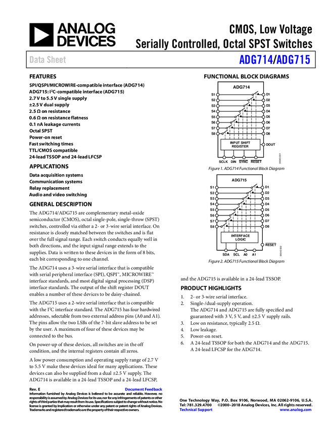 ADG715 CMOS, Low Voltage, SPI/QSPI/Microwire Compatible Interface, Serially Contr...