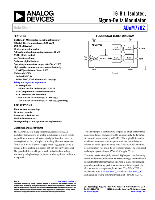 ADUM7702 16-Bit, Isolated, Sigma-Delta Modulator