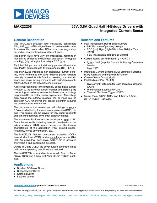 MAX22208 65V, 3.8A Quad Half H-Bridge Drivers with Integrated Current Sense