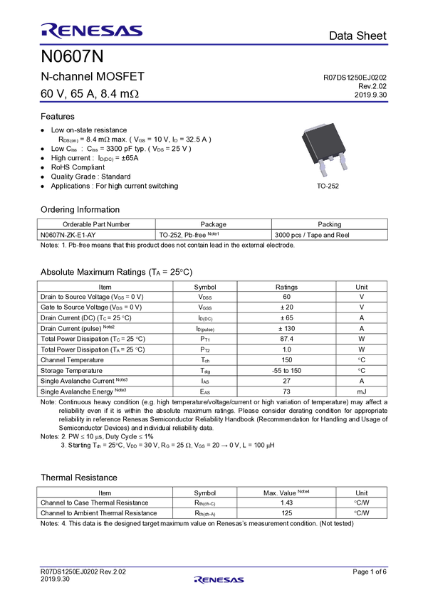 N0607N Nch Power MOSFET 60V 65A 8.4mohm TO-252 / DPAK