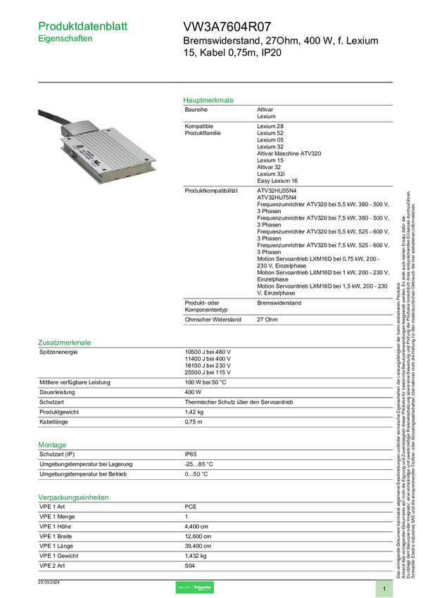 Schneider Electric VW3A7604R07 Rezystor hamujący 1 szt.