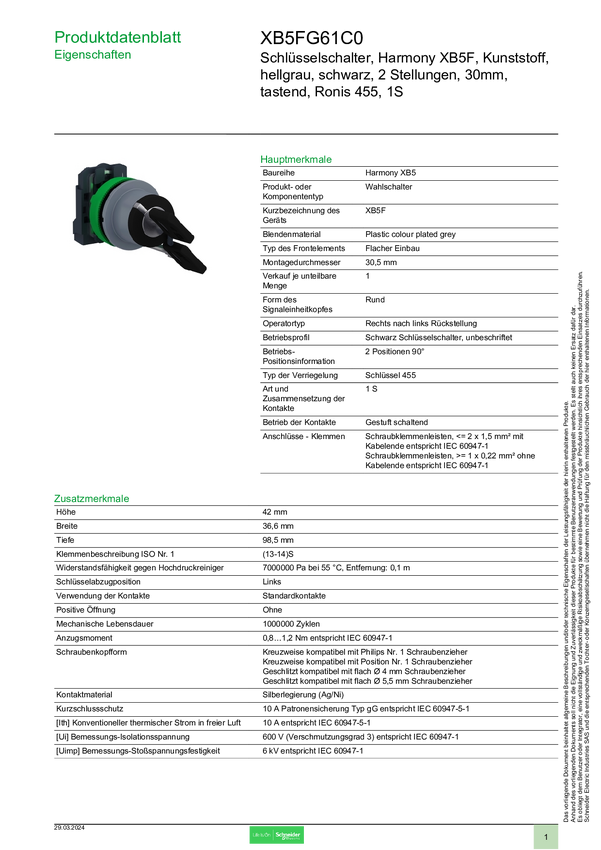 XB5FG61C0 Schneider Electric XB5FG61C0 Przełącznik kluczykowy 1 szt.