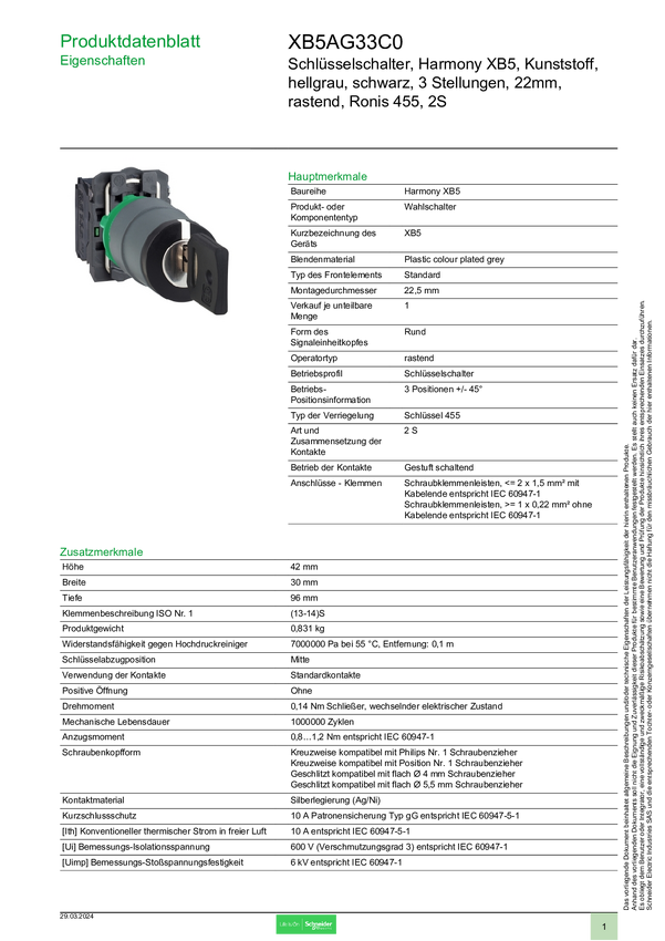 XB5AG33C0 Schneider Electric XB5AG33C0 Przełącznik kluczykowy 1 szt.