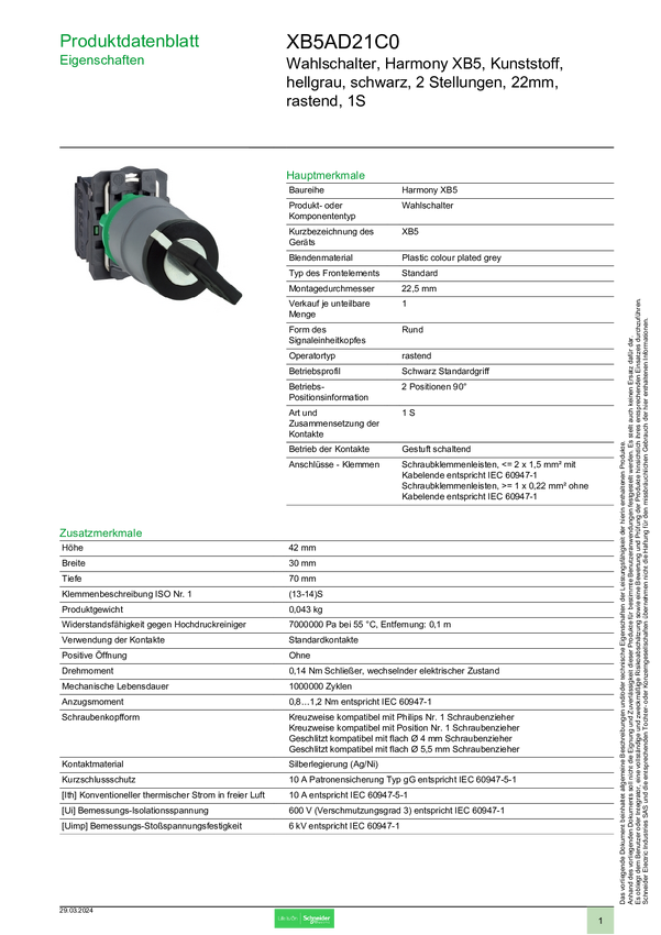 Schneider Electric XB5AD21C0 Przełącznik wyboru 1 szt.