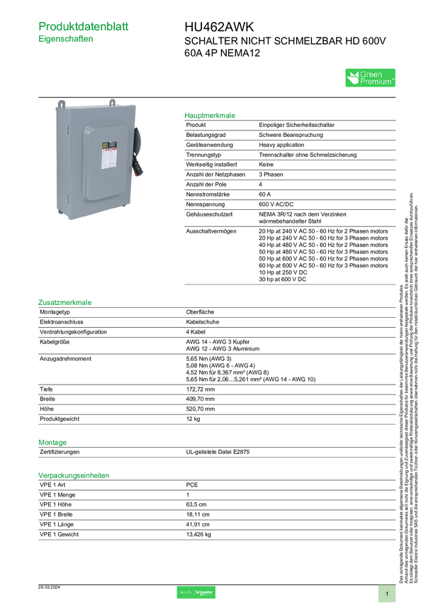 HU462AWK Schneider Electric HU462AWK HU462AWK Akcesorium do wyłącznika mocy 1 szt.