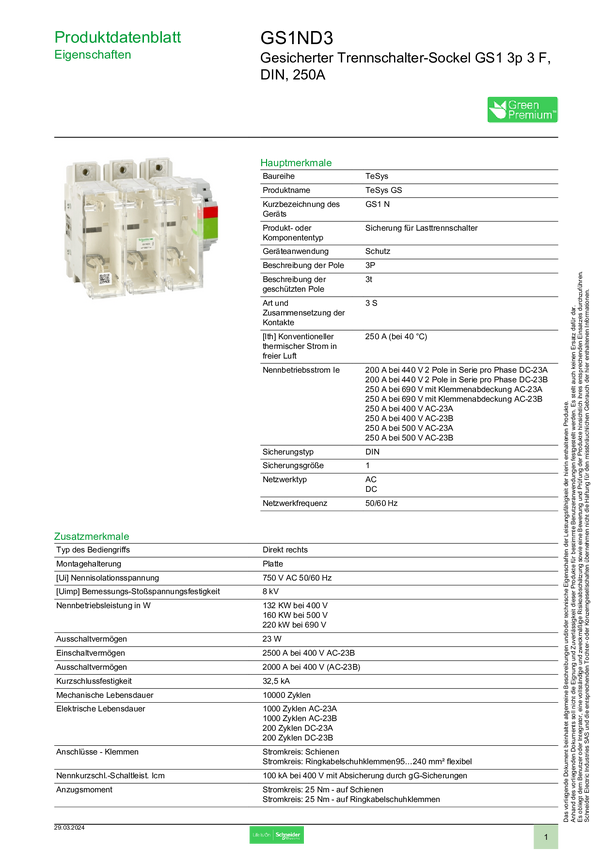 GS1ND3 Schneider Electric GS1ND3 Podstawa, Przełącznik rozłączający 1 szt.
