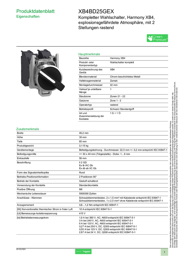 Schneider Electric XB4BD25GEX Przełącznik wyboru 1 szt.