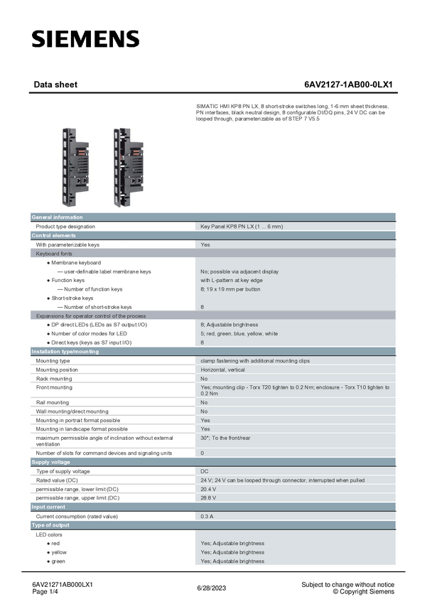 6AV21271AB000LX1 Panel przycisków SIMATIC HMI KP8 PN LX (1-6mm) Siemens 6AV2127-1AB00-0LX1 1...