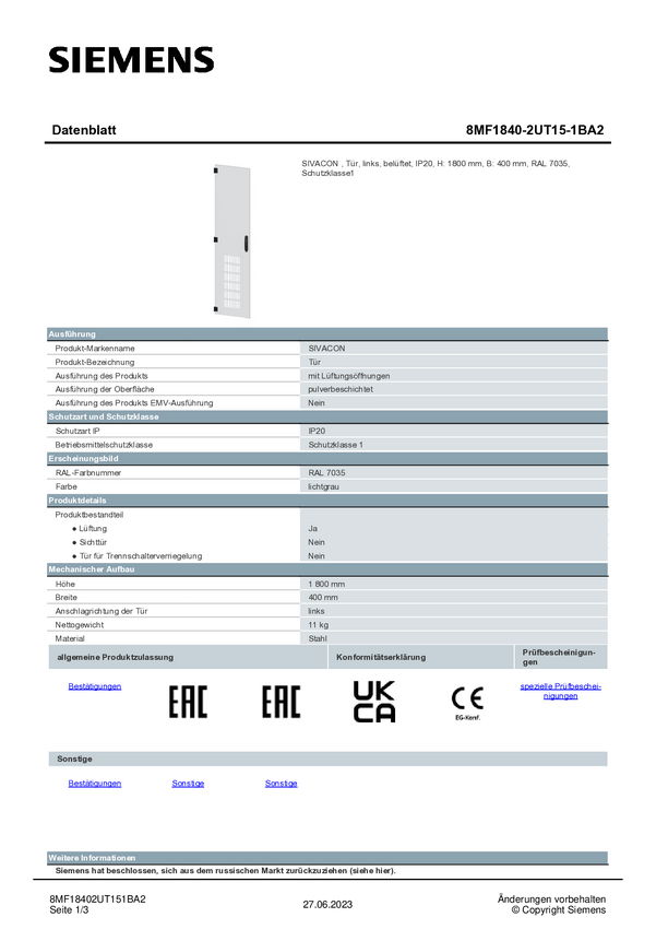 8MF18402UT151BA2 Drzwi Siemens 8MF1840-2UT15-1BA2 1 szt.
