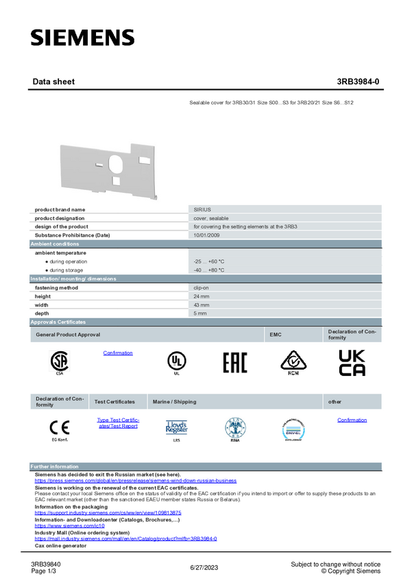 3RB39840 Siemens 3RB39840 3RB3984-0 Pokrywa 1 szt.