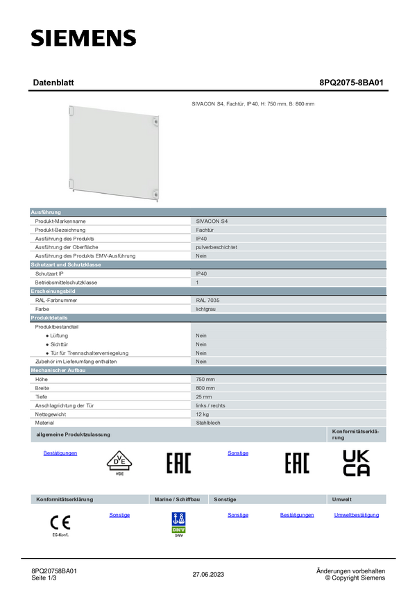 Drzwi półki Siemens 8PQ2075-8BA01 1 szt.