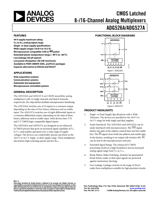 ADG527A: Latchable Differential 8 Channel Multiplexer (Latched ADG507A)