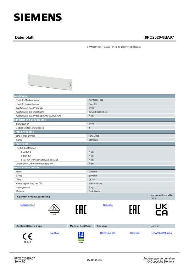Drzwi półki Siemens 8PQ2020-8BA07 1 szt.