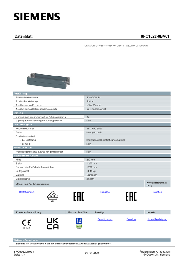 Podstawa narożników Siemens 8PQ1022-0BA01 1 szt.