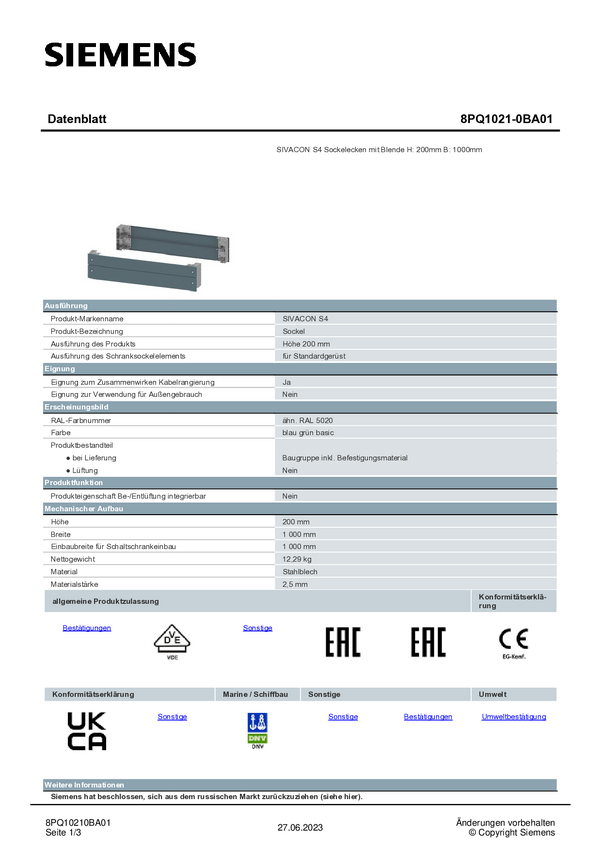 Podstawa narożników Siemens 8PQ1021-0BA01 1 szt.