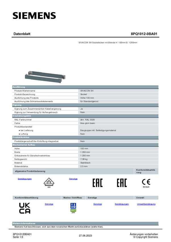 Podstawa narożników Siemens 8PQ1012-0BA01 1 szt.