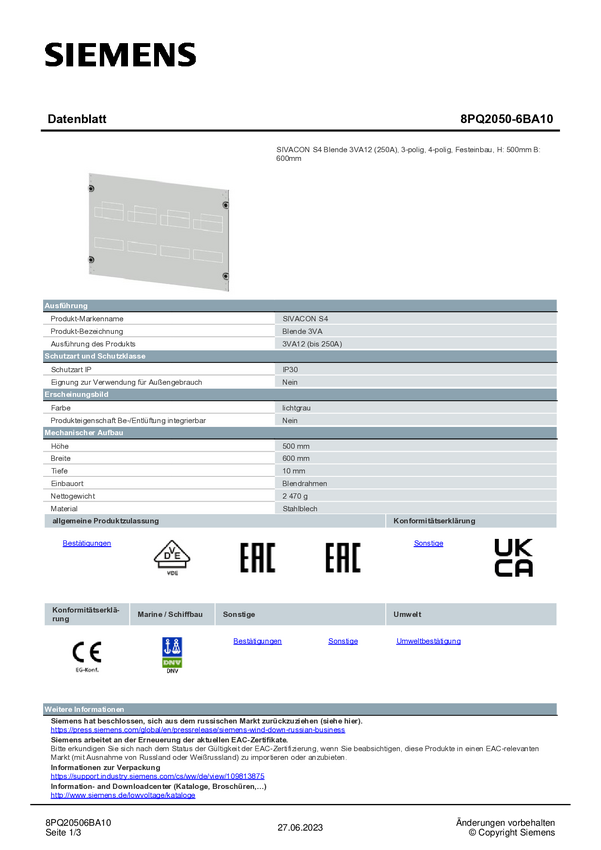 8PQ20506BA10 Przesłona Siemens 8PQ2050-6BA10 1 szt.