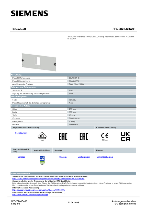 8PQ20206BA36 Przesłona Siemens 8PQ2020-6BA36 1 szt.