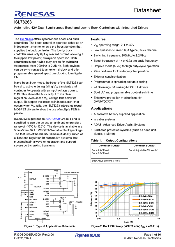 ISL78263 Automotive 42V Dual Synchronous Boost and Low-Iq Buck Controllers with Inte...