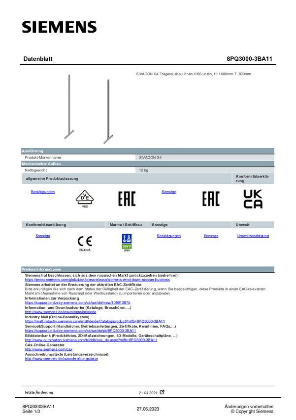 8PQ30003BA11 Konstrukcja nośna Siemens 8PQ3000-3BA11 1 szt.