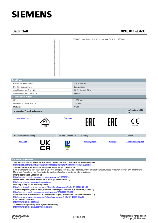 Zbrojenie podłużne Siemens 8PQ3000-2BA88 1 szt.