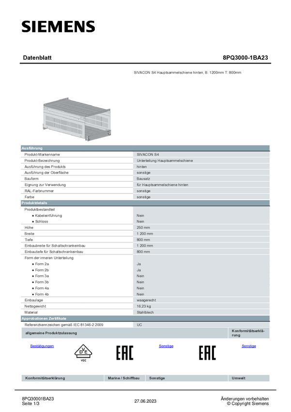 8PQ30001BA23 Główna szyna zbiorcza Siemens 8PQ3000-1BA23 1 szt.