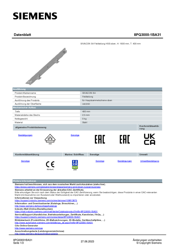8PQ30001BA31 Podział na pola Siemens 8PQ3000-1BA31 1 szt.