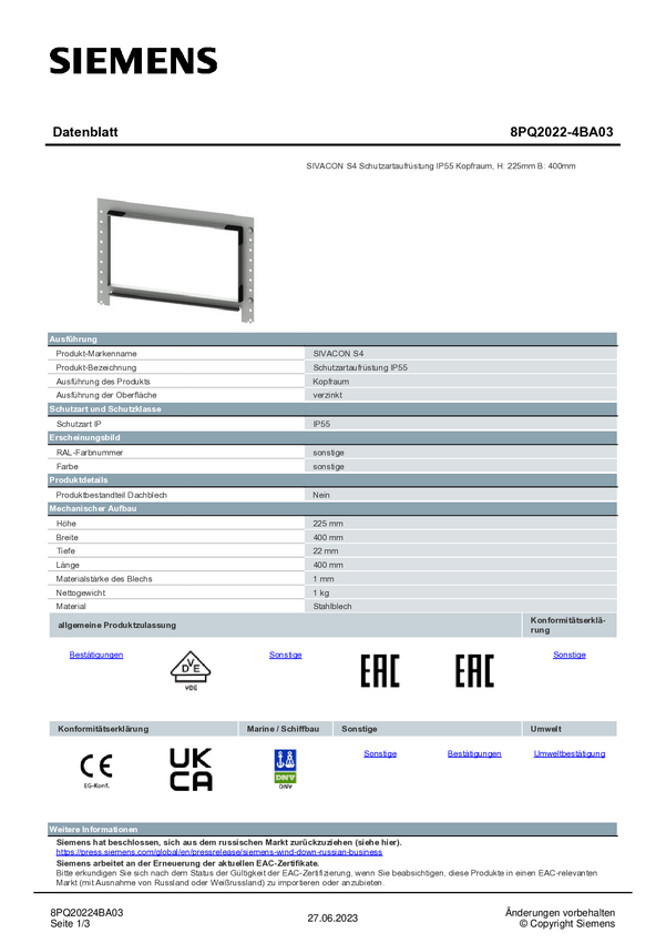 Aktualizacja typu ochrony Siemens 8PQ2022-4BA03 1 szt.