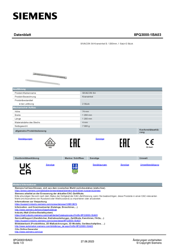 Kąt nachylenia dźwigu Siemens 8PQ3000-1BA03 1 szt.
