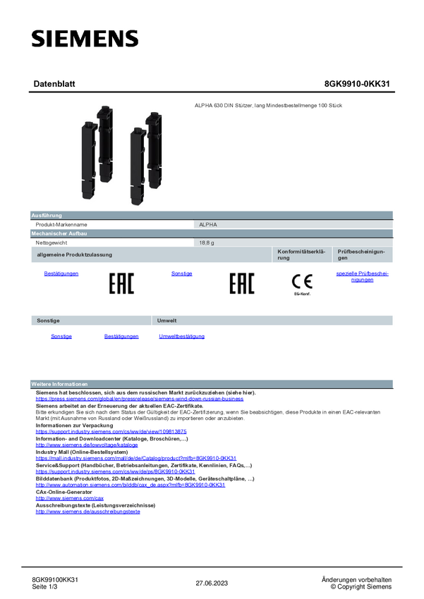 Wspornik Siemens 8GK9910-0KK31 100 szt.